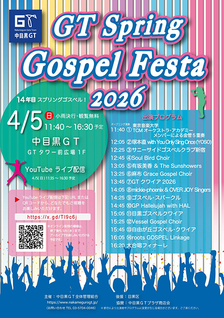 GT Spring Gospel Festaは、目黒区をはじめ、東京エリアで活動するゴスペルグループが集まるステージとして2013年から続くイベントです。